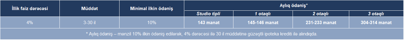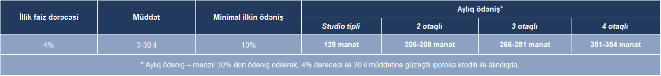 Bu elan çərçivəsində mənzillərin satışı həm ipoteka kreditindən istifadə etməklə, həm də öz vəsaiti hesabına ödəniş üsulu ilə nəzərdə tutulmuşdur.