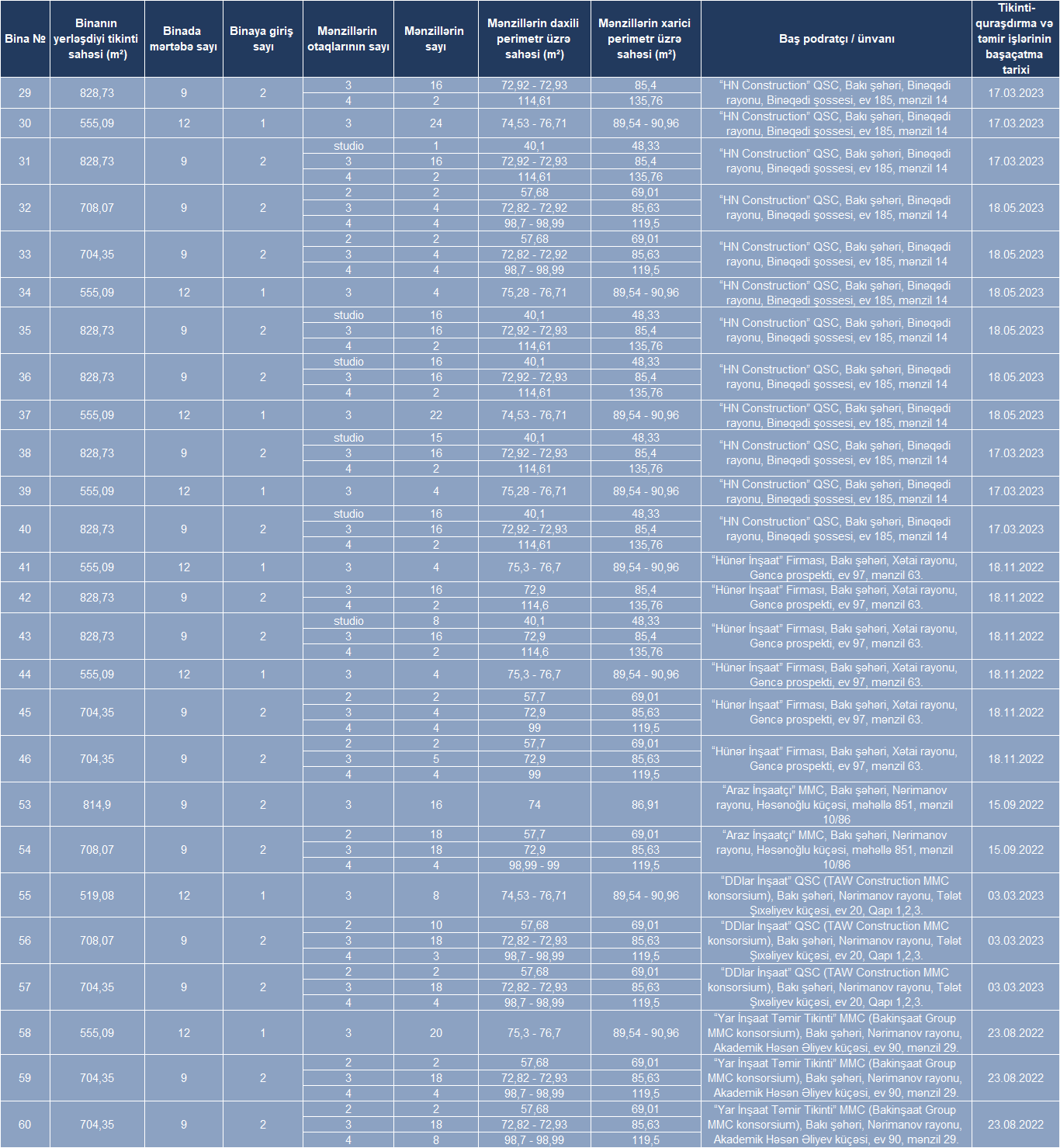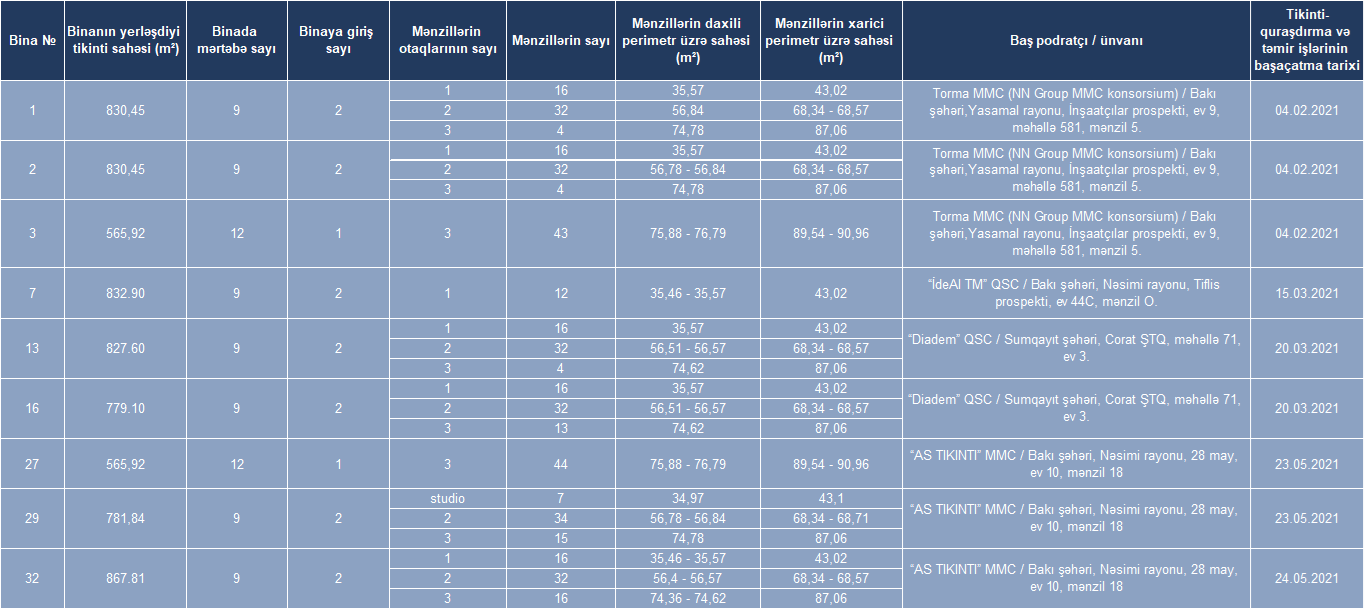 Satışa Yasamal Yaşayış Kompleksinin ikinci mərhələsi üzrə 436, Hövsan Yaşayış Kompleksinin ikinci mərhələsi üzrə 510, Gəncə Yaşayış Kompleksi üzrə 243 olmaqla, ümumilikdə 1189 mənzil çıxarılır. Bütün mənzillər tam təmirli, mətbəx mebeli, kombi isitmə sistemi (kombi cihazı daxil olmaqla), su, qaz və elektrik sayğacları ilə təmin edilmiş vəziyyətdə təklif olunur.