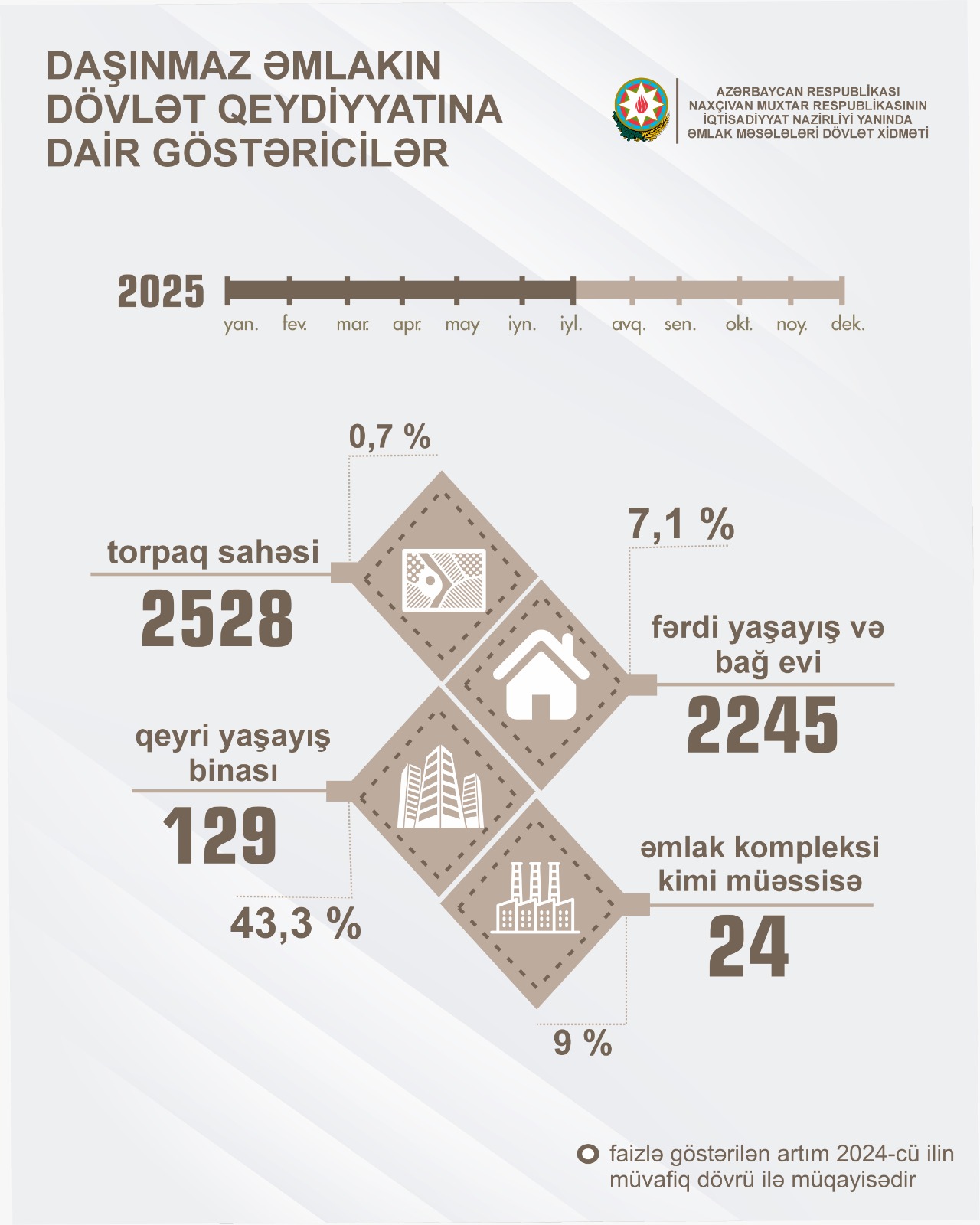 2025-ci ilin yanvar-iyul aylarında Naxçıvan Muxtar Respublikasının daşınmaz əmlakın dövlət reyestrində 129 qeyri-yaşayış binası, 2528 torpaq sahəsi, 2245 fərdi yaşayış və bağ evi, 24 əmlak kompleksi kimi müəssisə dövlət qeydiyyatına alınmışdır.